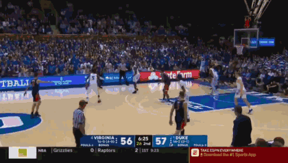防守回合中,弗吉尼亞球員在罰球線接球,然後右側突入禁區拋投,但是Williamson已經直接預判起跳,直接送上一記無敵平框雙手攔網式超級血帽……