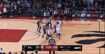 在Leonard完成反超暴扣後,Bertans沒能打進反超進球,Lowry的後場籃板也被判定並未出線,球權重新回到暴龍手中。此時時間還剩下1.1秒,馬刺也只落後1分,還是有機會通過犯規戰術和博三分追平甚至反超的。