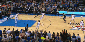 當時雷霆命中關鍵球反超1分,只留給灰狼5秒鐘時間,還要從後場發球,想要打成可謂是難上加難。Wiggins在後場接球後立刻向前推進,過了半場已經沒多少時間,他迅速調整姿勢,在距離弧頂三分線還有兩步的地方就強行拔蔥,結果這一球神奇的打板命中,與此同時終場紅燈也亮了起來。