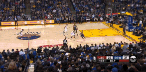 好在,此節最後一攻,Curry貢獻了精彩鏡頭,場上時間幾乎沒有多少了(3.9秒),勇士和時間賽跑,Curry接格林的傳球,面對兩名大老遠就撲出來防守的快艇球員,他各種運球擺脫,移動出一丁點空間後就根本不看筐出手,球命中!