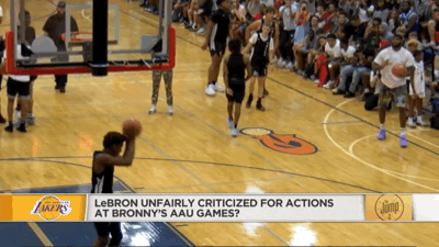 8月2日,湖人當家超巨詹姆斯近日在大兒子布朗尼的AAU比賽前上場熱身並即興表演了幾次精彩灌籃。