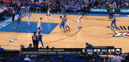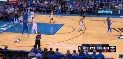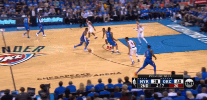 在Donovan的安排當中,球隊當下的協作方式顯得很簡單,威少弧頂持球,George和Anthony強弱側一邊一個,Adams上提給威少作掩護,Roberson則伺機尋找空切反跑的機會。至於怎麼終結?多由威少決定,且有大量的「一次傳球終結進攻」,就像下圖這樣: