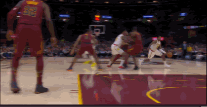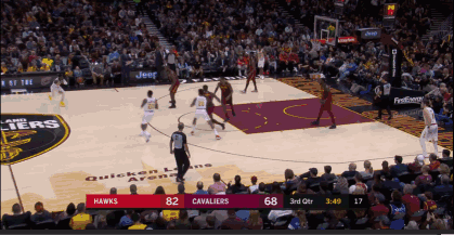 在第三節還剩4分36秒有一個令人驚悚的鏡頭。老鷹側翼Kent Bazemore試圖完成一個突破暴扣,但是他在空中遭到兩名騎士球員的犯規,而且Bazemore因為在空中失去平衡而重重地摔倒在地。
