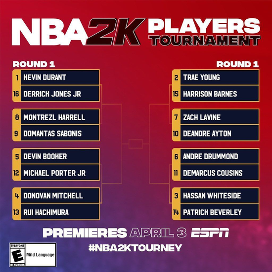 這一次的參賽球員共有16位,球員的種子順位是依據他們在2K遊戲里面的數據排位,杜蘭特是第1種子,特雷楊、大白邊、Mitchell、Booker等人緊隨其後。