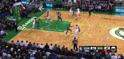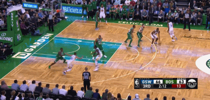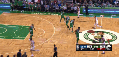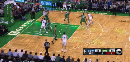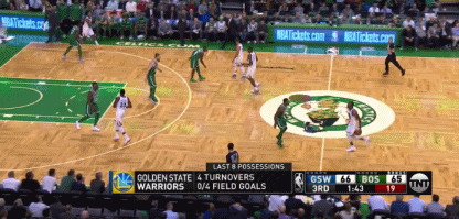 Curry從在弱側跟Looney做無球掩護,Brown在身後緊追,格林分球給到跑到罰球線的Curry,Baynes換防補位,Curry下順,Smart和Brown收縮,Curry擊地分歧跟進的Looney,在夾擊干擾當中遺憾出界。