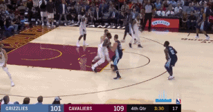 比賽還有4分47秒,騎士將優勢擴大至107-96,似乎已將勝利揣入囊中,JaMychal Green右側籃下強打Jeff Green頂兩下沒頂動,進攻時限還有2.7秒時將球分給右側弧頂Tyreke Evans,詹姆斯上前延阻,Evans向右運一步調整,爾後以詹姆斯高高舉起的手臂為標尺,強行出手,皮球應聲入網。仔細看一眼老詹的表情,嗯,沮喪中夾雜著質疑,這是真的嗎?
