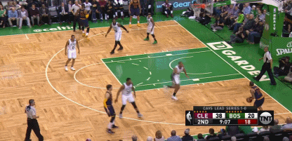 塞爾提克這場比賽,針對Thompson的特點,做了非常明確的針對,方式就是在爭搶籃板球的時候,讓一名球員始終卡在Thompson的身前,阻止他完全起跳,而後讓其他球員去搶這個籃板。比如這樣: