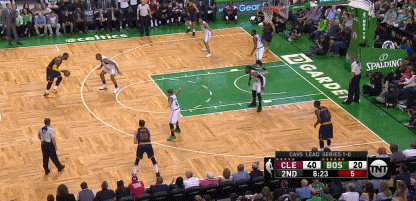上個靜態圖的延續。James讓Jefferson沉底線,上線給James最大的空間一對一單挑Horford,塞爾提克該2-3聯防,防止James衝籃下,調整兩步節奏之後,James後仰跳投輕鬆得手。
