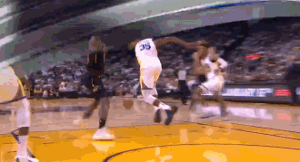 今天比賽進行到第二節還剩不到5分鐘,騎士的韋德在低位背打尼克-楊,並準備完成標誌性的後仰翻身跳投,結果杜蘭特突然過來協防,並將韋德的投籃扇掉,而且勇士隊獲得了球權。