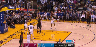 第二節最後階段,騎士隊的詹姆斯在籃下得球並獲得很好的出手機會,當時杜蘭特沒有截掉騎士的傳球,所以他已經漏掉了詹姆斯,但是格林突然殺了出來,並將詹姆斯的籃下出手蓋掉。
