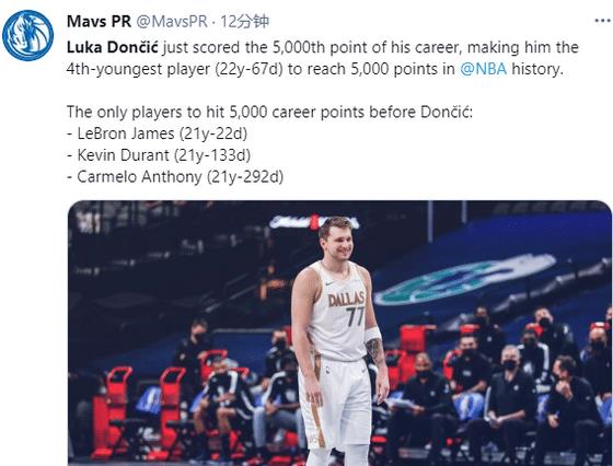22歲Doncic里程碑之夜,獨行俠官方第一時間祝賀Doncic,曬Doncic三大紀錄,並且發推寫道:現役最快5000分先生,他的生涯才剛剛開始而已。