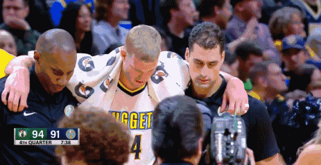 1月30日,金塊主場迎戰塞爾提克。第四節還剩7分多鐘,金塊首發大前鋒Mason Plumlee在一次爭搶球權的過程中不慎右腿受傷,最終被隊友攙扶著離場。