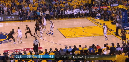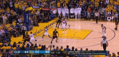 Irving接到James的傳球,大跨步上籃得手。當時的計分板上寫著82比86,騎士只落後4分,距離第三節結束還剩5分42秒。勇士立刻請求了暫停。