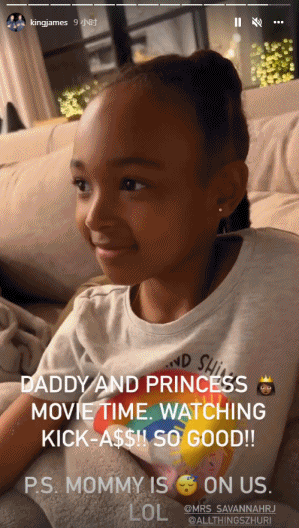 4月10日訊 今日,湖人球星LeBron James更新社媒,曬出了與小女兒zhuri一起看電影的動態。