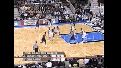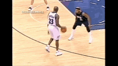 Jordan單手持球,本來準備底線突破,觀察到底線已經有提前準備包夾的球員隨即背打比自己高出一頭的Garnett,跳步,後仰,一氣呵成。