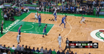 好不容易等到綠軍進入輪換時間,Embiid在次節剛開始的一段時間,低位強打塞爾提克替補中鋒Baynes。儘管利用對抗已經擠進禁區,不料他近在咫尺的上籃卻遭到了Rozier的飛身血帽。Embiid的這次大意,讓自己成為今日五佳球的背景板。