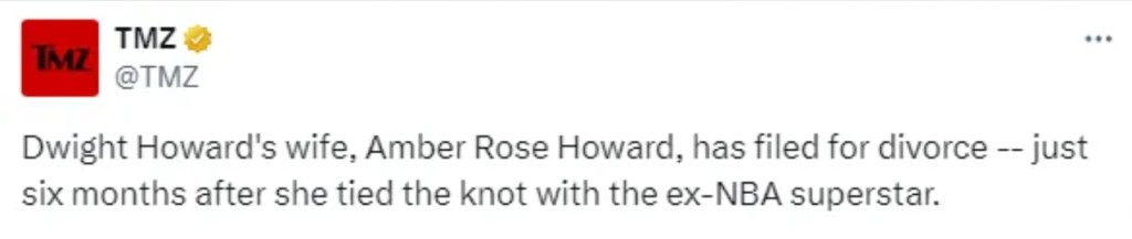 7月9日,據美媒TMZ報導,前NBA球星德懷特-霍華德(Dwight Howard)被離婚,僅結婚半年他的妻子就申請離婚,要求平分財產和撫養費。