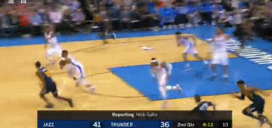 當時比賽進行到第二節還剩4分多鐘,雷霆發動快攻,威少快速運球至前場,他看到了身後跟進的喬治,並用一個擊地傳球把球給喬治。與此同時,安東尼已經殺到了籃下,當看到威少把球傳給了喬治,安東尼可能以為沒他什麼事了,便直接跑向底線。