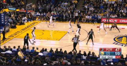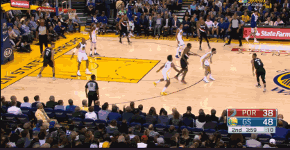 這是數據統計中所體現出來的封蓋,還有一些回合,杜蘭特沒有直接完成封蓋,但他的威懾力卻發揮了重要的防守作用。第三節進行到9分33秒,勇士失誤被對方打反擊,Evan Turner發現杜蘭特在身後追防,沒敢直接上籃,而是把球交給了後面的Lillard,結果Jordan Bell也已經追了回來,一把將球扇飛。