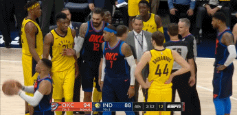 第四節還剩2分多鐘,雷霆半場進攻,Anthony和Young發生肢體接觸,當時Young衝著Anthony的方向揮了一拳,但是沒有打中。隨後他倆面對面對峙,而Young的情緒顯得十分激動,他還用手指著Anthony的臉,嘴里罵罵咧咧。Anthony倒是顯得很淡定,沒有動手。