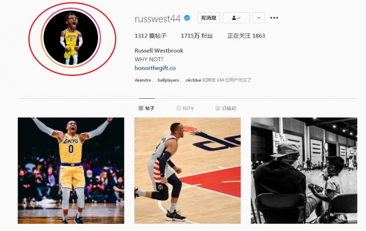 Westbrook更換INS頭像:身著湖人0號球衣!