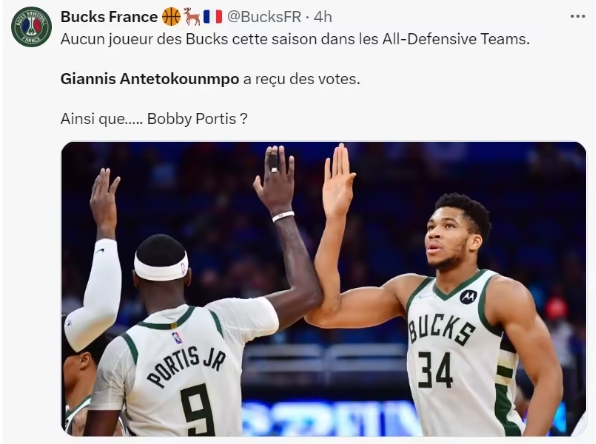 有法國球迷提到:公鹿是東區第三,但他們陣容中竟然沒有一人入選最佳防守陣容,字母哥(Giannis Antetokounmpo)再度落選。