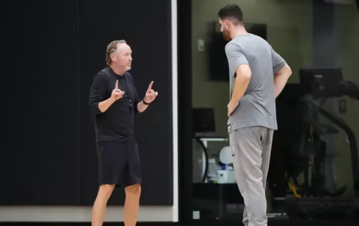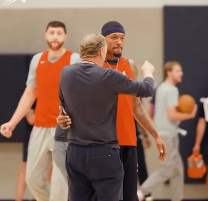 訓練期間,布克、比爾(Bradley Beal)、歐尼爾等人都賣力防守,布登霍爾澤現場指導比爾;布克也化身布指導,指揮諾基奇如何站位以及防守。