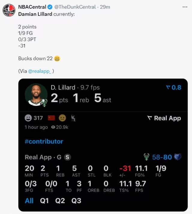 上半場打完里拉德20分鐘,9中1,三分3中0,拿到2分5助攻1籃板,命中率11.1%,正負值-31。里拉德這個表現的確令人無奈啊。