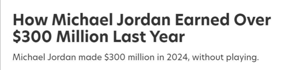 2023年,喬丹品牌為Nike創造了約70億美元的收入。按照他4%-5%的提成比例估算,僅過去一年,喬丹從Nike一家就賺得約2.6億至2.8億美元。這使他的總收入超過了全球所有現役運動員,甚至超過了克里斯蒂亞諾-羅納爾多和泰格-伍茲。