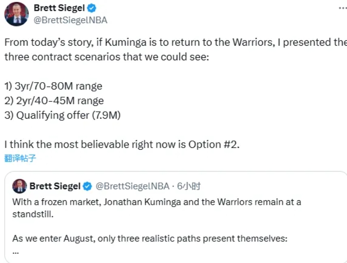 Siegel還表示,我曾報導過庫明加最有可能的情況就是回歸勇士,我現在依然認為這是最有可能發生的情況;在回歸勇士的情況下,有三種合約樣式——3年7000~8000萬美元;2年4000~4500萬美元和1年790萬美元資質報價,最有可能的是第二個選項。