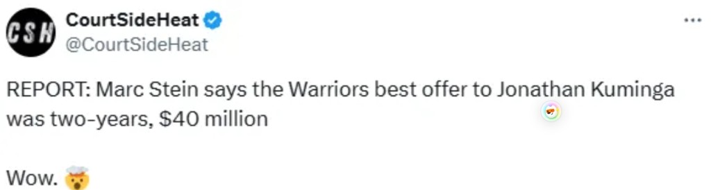 7月30日,勇士和庫明加(Jonathan Kuminga)之間的鬧劇仍在繼續,據美媒Clutch Points記者Brett Siegel報導,庫明加方面仍然堅定地想要3000萬美元年薪的長期合約,但勇士給他開的合約年薪沒有超過2300萬美元。
