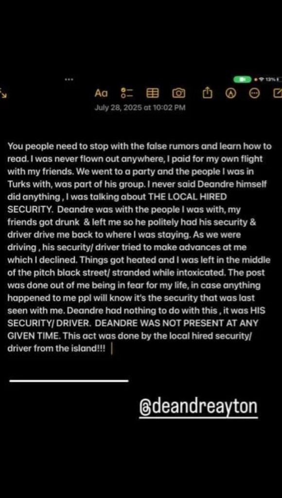「我發那條動態是因為當時很害怕,擔心自己出事,這樣大家就會知道最後和我在一起的是那些安保人員。艾頓與此事毫無關係,是他的安保 / 司機幹的。艾頓自始至終都不在場。這是島上當地雇的安保 / 司機的行為。」