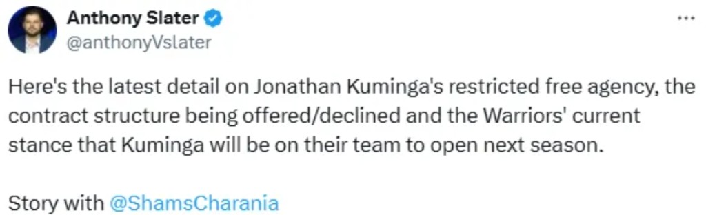 據名記shams報導,勇士想要挽留庫明加並且開出2年4500萬美元新合約,但由於勇士堅持合約帶有球隊選項且讓其放棄交易否決權,庫明加果斷拒絕這份合約,他認為這份合約讓勇士掌握過多的控制權。