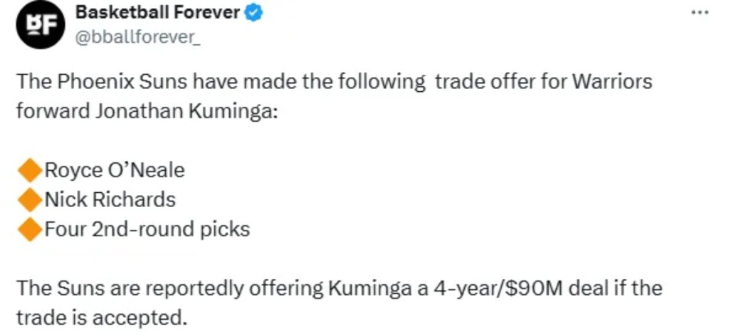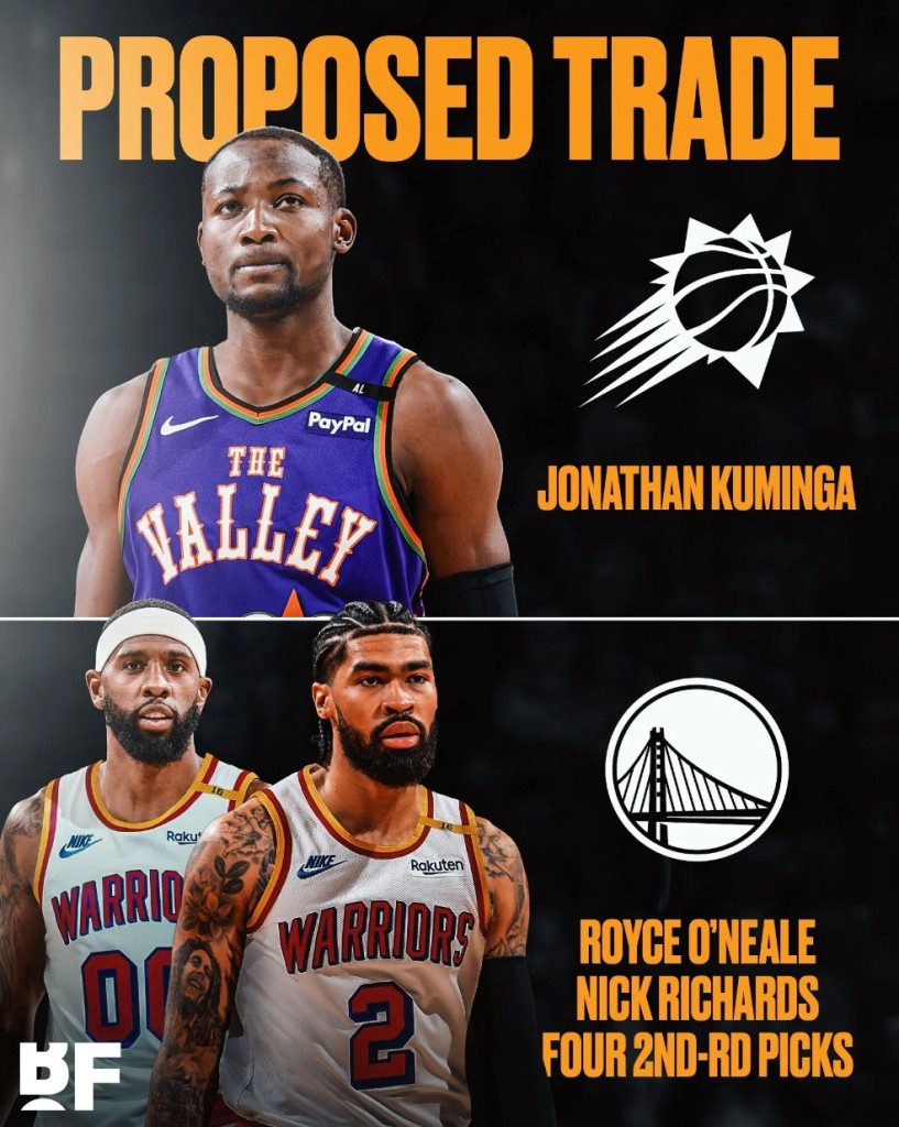 據Mar Spears報導,太陽給勇士的報價為羅伊斯-奧尼爾、理查茲和四個次輪籤,若勇士接受這份報價,太陽將和庫明加簽下4年9000萬美元大合約;勇士對此沒興趣,他們想要鄧恩,但太陽拒絕在庫明加簽換交易中搭上鄧恩,他們相信鄧恩能夠成為一名優秀的3D球員。