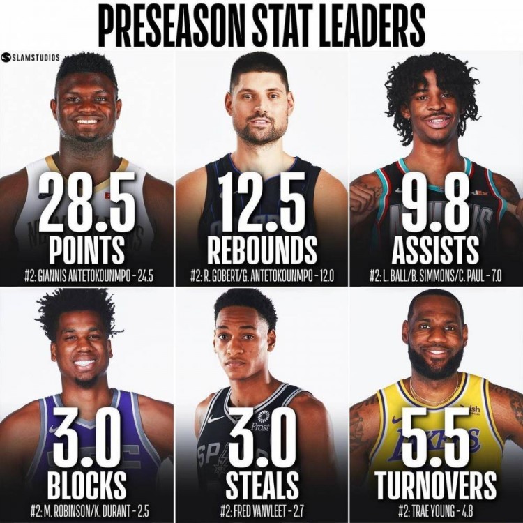 NBA熱身賽結束後,美國媒體Slamstudios統計出了今年熱身賽各項數據的領跑者榜單。