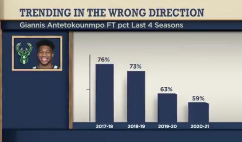 兩屆例行賽MVP字母哥,在本賽季遇到了嚴重的罰球問題,本賽季,字母哥的罰球命中率只有58.5%,是其職業生涯新低。而值得一提的是,字母哥的罰球,已經連續4個賽季下滑,而從2017-18賽季76%的罰球命中率,到如今不足6成,為何字母哥的罰球會出現斷崖式下滑呢?前NBA球星卡特也在節目中對此進行了專業分析。