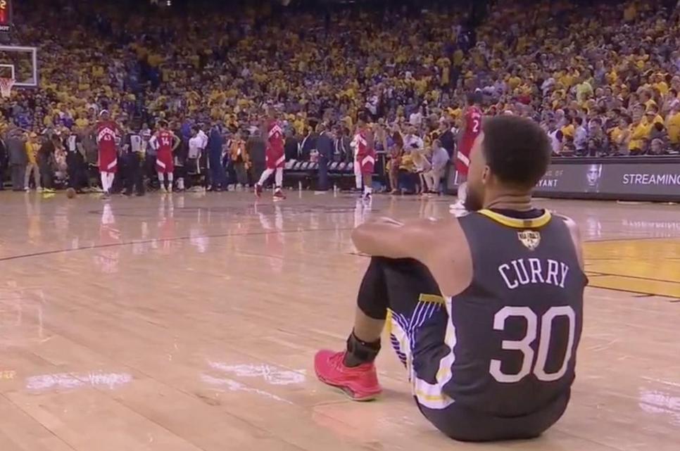 湯普森在一次快攻當中落地時扭到了膝蓋,根據慢鏡頭回放,湯普森的膝蓋有一次側向的扭曲,觸目驚心。那一刻甲骨文主場瞬間安靜了,科爾一瞬間摀住了臉,所有人迅速向湯普森圍攏,而當時有誰注意場上的Curry?他將籃球重重的砸向了地板,那一瞬間充滿了憤怒,Curry靜靜地坐在了球場的另一邊,用水平於地板的視角看著自己的兄弟湯普森,狠狠地咀嚼著牙套。