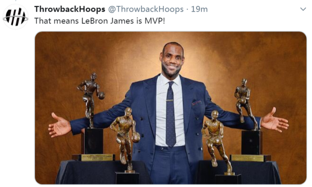 如果字母哥也拿下本賽季的例行賽MVP,他將成為NBA歷史上第三位同年獲得MVP和最佳防守獎的球員,此前喬丹和大夢都曾經做到過。也有球迷很樂觀,曬出了一張詹姆斯的照片,寫道:“這意味著MVP屬於詹姆斯了!”不過,這顯然幾率不大,據大部分記者公佈的投票情況來看,字母哥拿下MVP已經是只待官宣了。