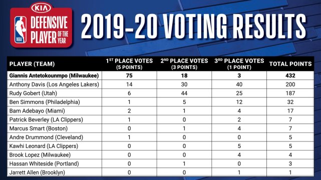 隨後,這一獎項的具體投票結果也公佈了。字母哥獲得了100張第一選票中的75張,總得分432分。湖人的一眉哥獲得14張第一選票,總得分200分。Gobert獲得6張第一選票,總得分187分。