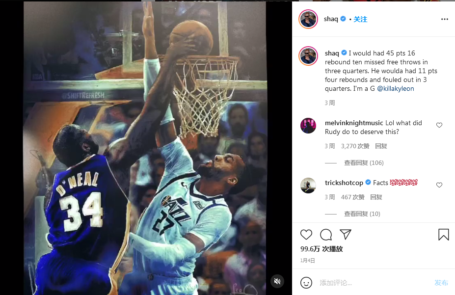 Gobert今夜火力全開,首節就得到10分4籃板,半場結束他已經拿下20分13籃板的豪華數據,完全統治了攻防兩端,比賽也早早失去了懸念。最終Gobert的數據定格在29分20籃板3阻攻3抄截,其中得分、籃板、抄截都是賽季新高。攻守全能的Gobert,用實際表現有力回擊了歐尼爾的質疑。