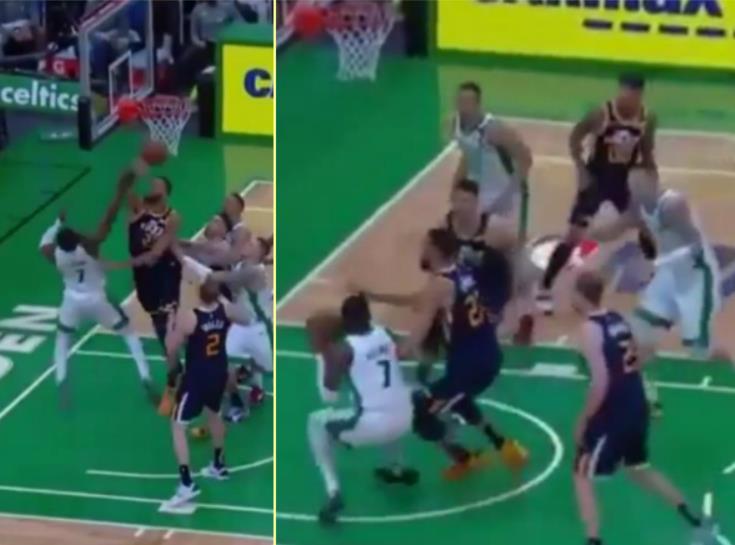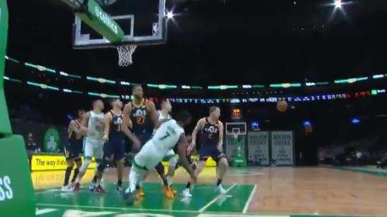 3月17日訊 塞爾提克vs爵士,在一次進攻中Jaylen Brown遭到Rudy Gobert血帽。