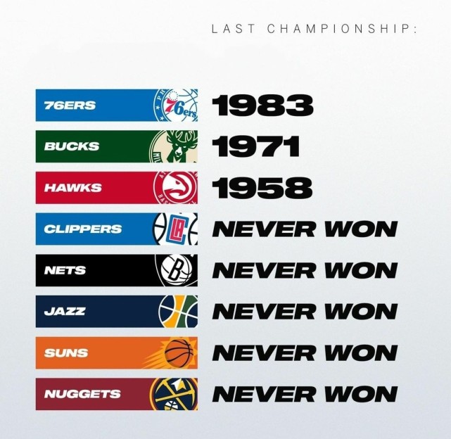 除了76人,距離上次奪冠時間最近的是公鹿,已經要追溯到1971年。那也是公鹿隊史上唯一一次奪冠。當時的公鹿在總冠軍賽里4-0橫掃子彈(巫師前身)奪冠,隊內的主要球星包括Kareem Abdul-Jabbar和Oscar Robertson。