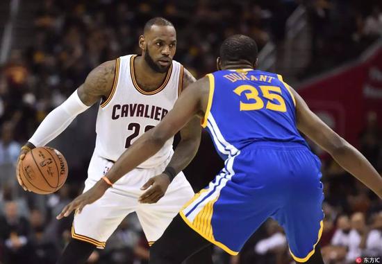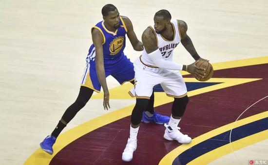 杜蘭特拿到籃板,持球推進半場,三分線外降速,兩步節奏調整,迎著James的干擾拔地而起,球進,反超1分,現場鴉雀無聲。