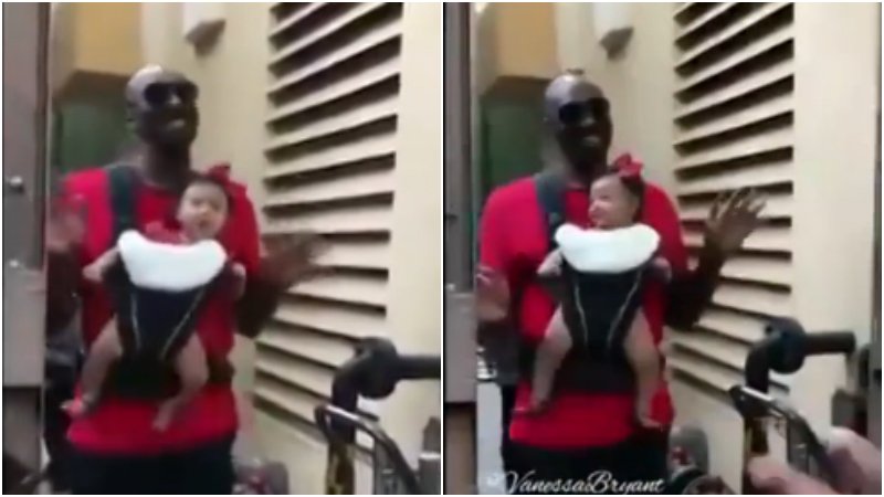 在影片中,Kobe用嬰兒帶背著Bianka,把她放在胸前對著鏡子又唱又跳,就為了逗小公舉開懷一笑。這樣的Kobe恐怕是球迷從沒在比賽場上見過的,看到小女兒跟他一起顛的開心,Kobe也完全變成了小孩的模樣,感覺完全可以去幼兒園唱唱跳跳了。