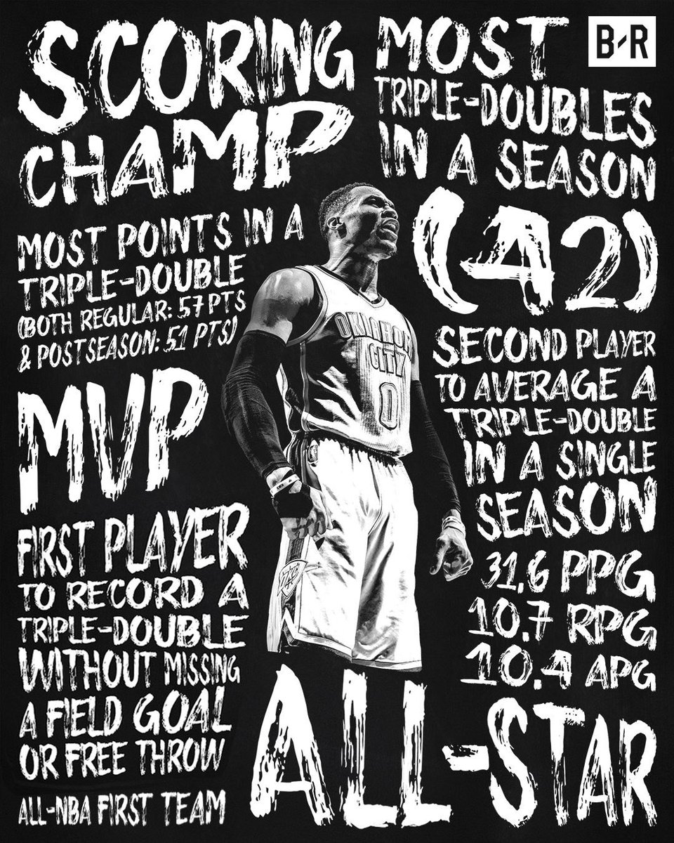 於是,在剛剛結束的2016-17賽季中,威少成了NBA現象級的球員,場均狂砍31.6分10.7籃板和10.4助攻,創造了單季42次大三元的前無古人恐怕也後無來者的紀錄,成為了新科例行賽MVP。