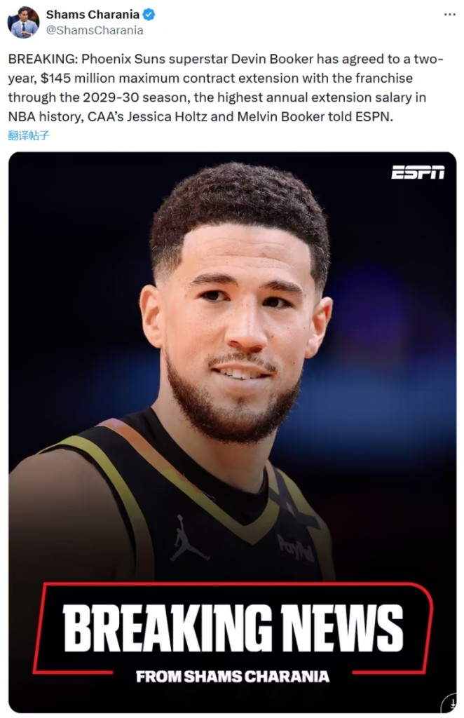 在最近一段時間內,太陽隊和布克一直在商討續約。據Shams今天報導稱,消息源透露,布克2年1.45億美元,頂薪提前續約太陽!此外,Shams還表示,布克創造了「提前續約」中的NBA歷史最高年薪。