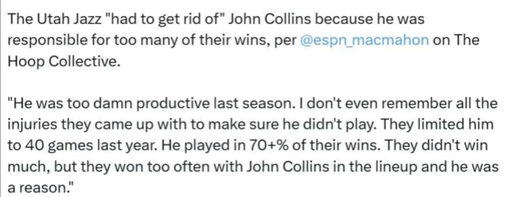 在談到爵士隊送走柯林斯的原因時,著名記者Tim MacMahon表示:「柯林斯上賽季效率太高了,我甚至都記不全爵士隊給他編的那些不讓他上場的傷病理由了。爵士上賽季限制他只打了40場比賽,爵士隊贏的比賽里70%都有他。爵士隊贏球雖然不多,但柯林斯上場的時候,他們贏得太頻繁了,原因就在他身上,所以爵士隊不得不送走他。」