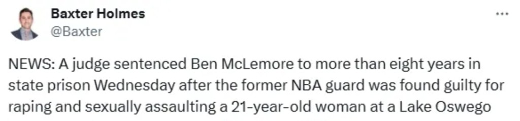 7月10日,前NBA球員本-麥克藍莫(Ben McLemore)強姦案正式宣判,因一級強姦罪和非法性侵罪被判處100個月的監禁。