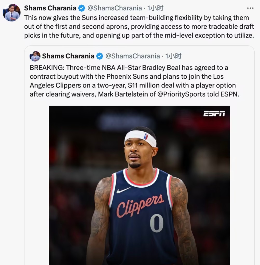 7月17日,據名記Shams報導,三屆全明星後衛布拉德利-比爾(Bradley Beal)同意與太陽達成買斷協議,他將會在度過澄清期後加盟快艇,比爾將會與快艇達成一份2年1100萬美元合約,該合約帶有球員選項。2026-27賽季的球員選項為32歲的比爾鋪平了道路,使他有機會成為明年夏天自由球員市場上最優秀的球員之一。