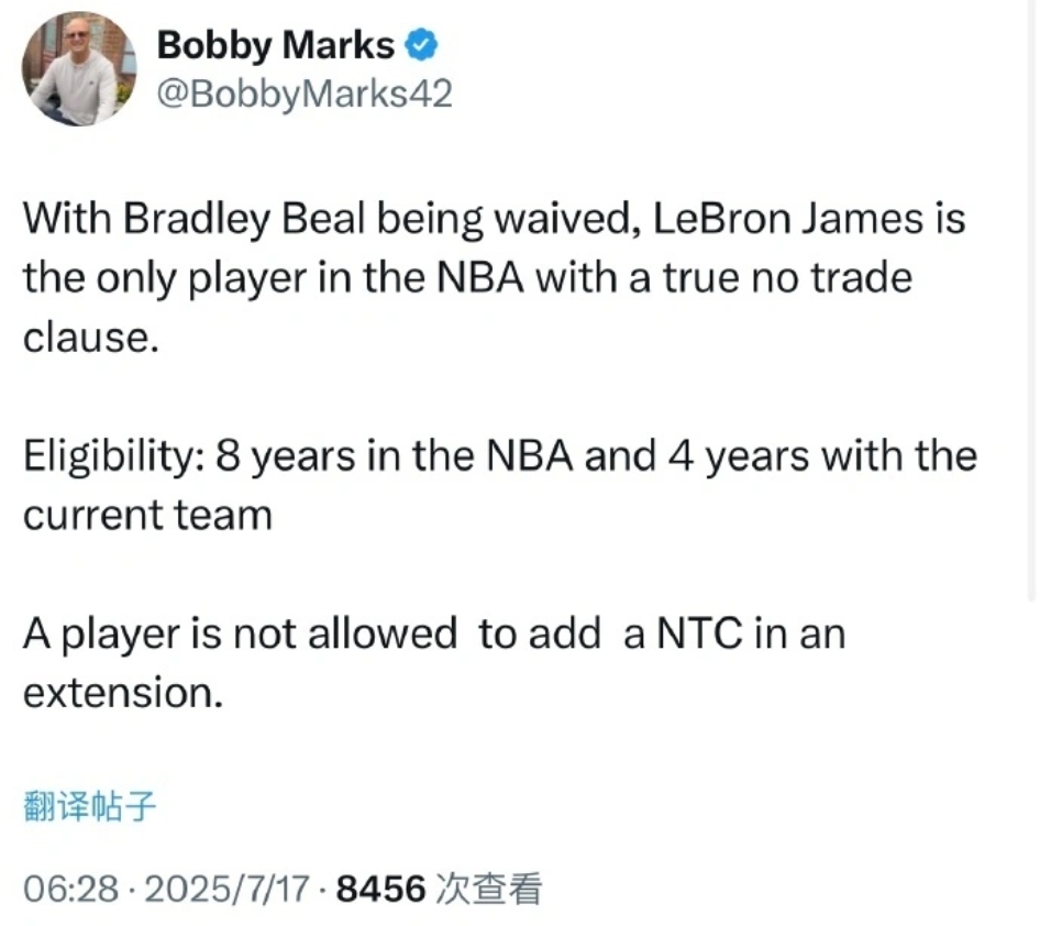 至於那些有意詹姆斯的所謂球隊,騎士與獨行俠均是先後表達過,不願意為了詹姆斯拆散現有陣容的想法,除非是詹姆斯買斷來投,但顯然不現實。至於湖人如果有交易的選擇,即既能創造薪資空間又能解決球隊其他需求,但均是繞不開詹姆斯擁有交易否決權。